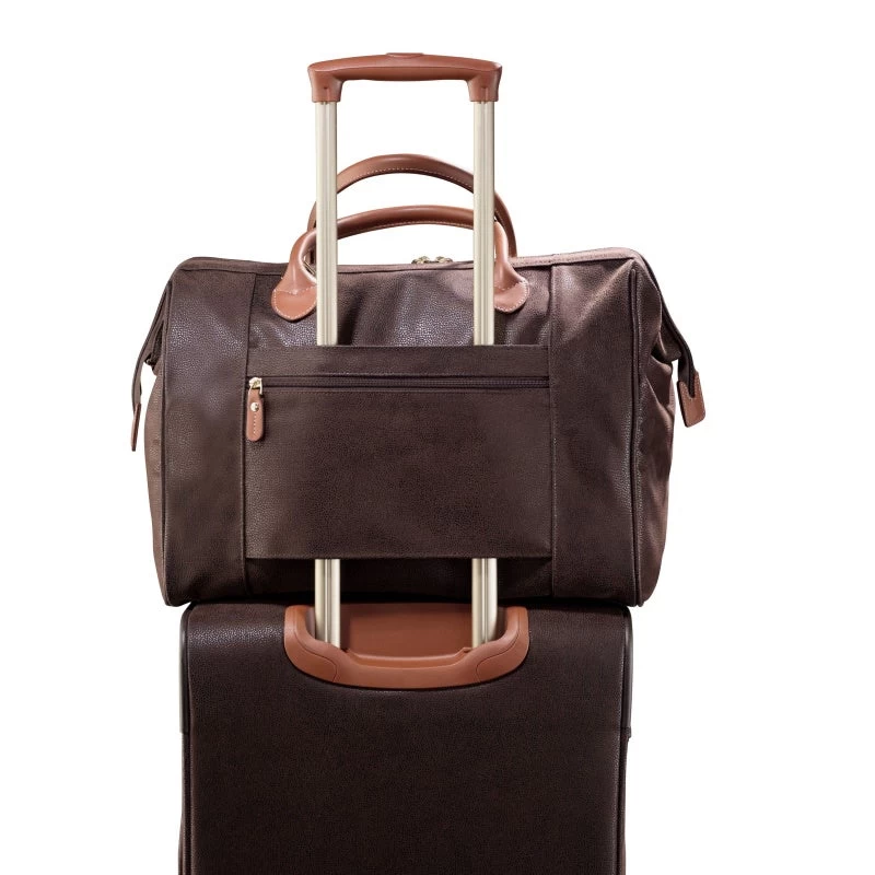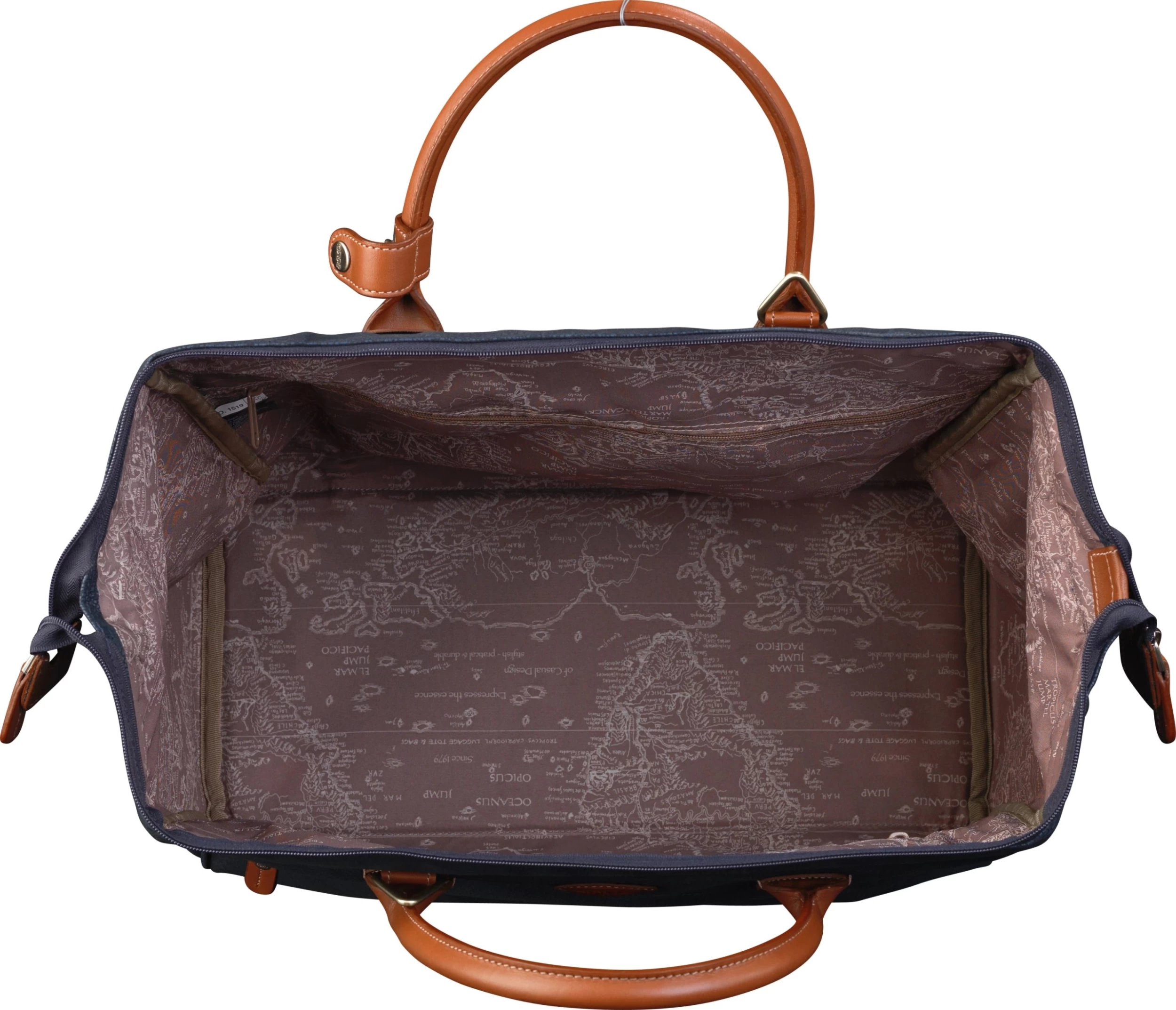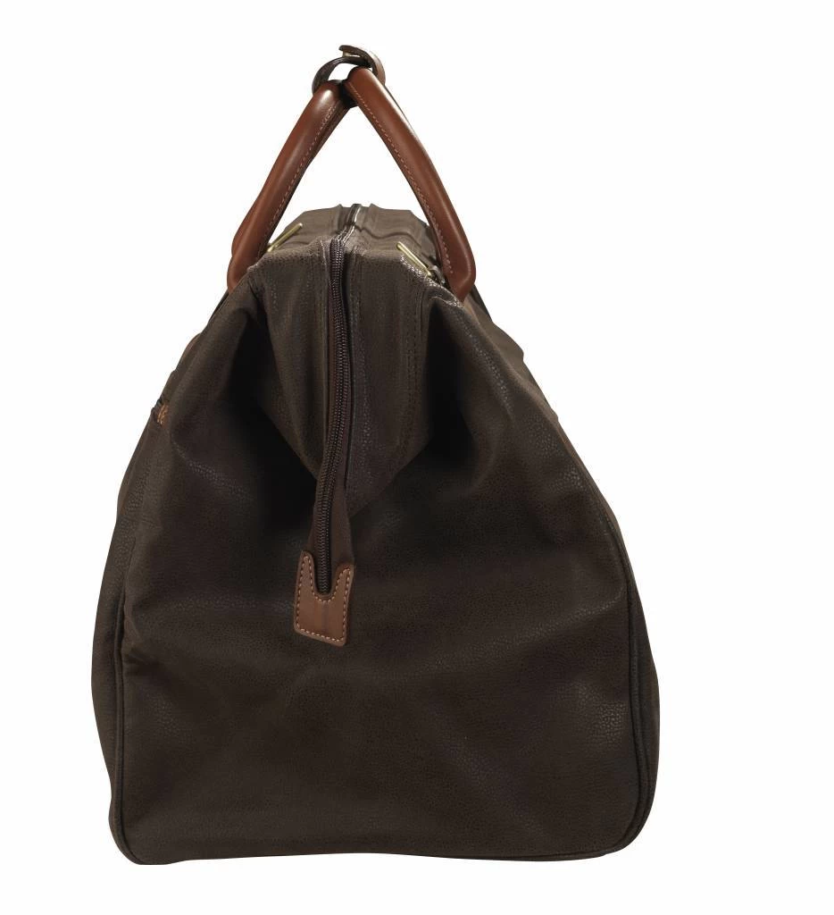 Door het gebruik van flockmateriaal afgewerkt met leer heeft deze weekend/reistas een unieke uitstraling en is het materiaal tevens waterafstotend. De tas is voorzien van twee beugels waardoor bij het openen de tas heel toegankelijk is. Daardoor is deze reistas erg geliefd onder de modebewuste en praktische reiziger die tijdens een vliegreis deze tas mee kan nemen als handbagage.