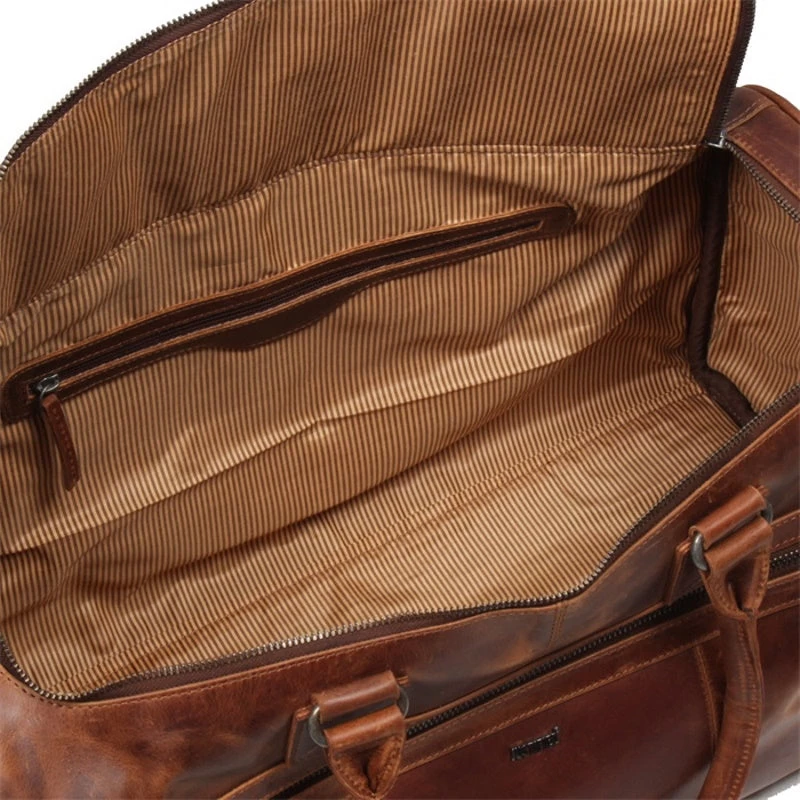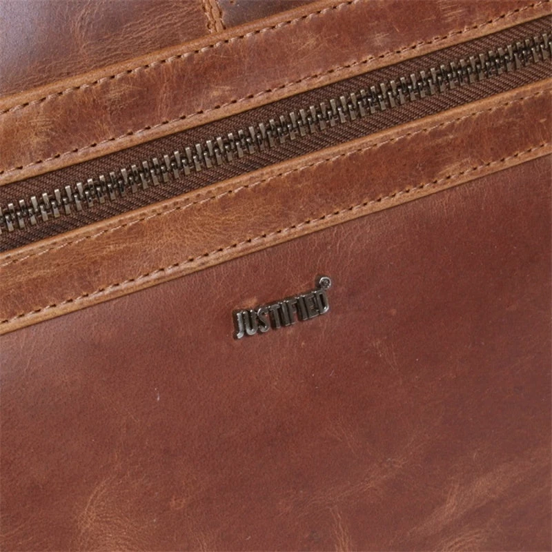 Stoere leren reistas van het merk Justified die is uitgevoerd in hoogwaardig,soepel gelooid kwaliteits leer. Tas heeft een groot hoofdvak dat afsluitbaar is met een U-vormige klep met ritssluiting. In het hoofdvak zit op de binnen achterzijde een klein ritsvak. Tevens zit in het hoofdvak een leren riempje vastgestikt met daaraan een sleutelring en mini zaklampje. Op de voorzijde van de tas zit een groot ritsvak. De tas is in de hand te dragen met de twee handvatten of over de schouder met de afneembare lange, verstelbare schouderband.
