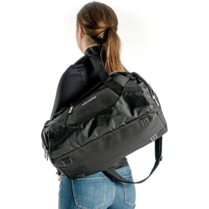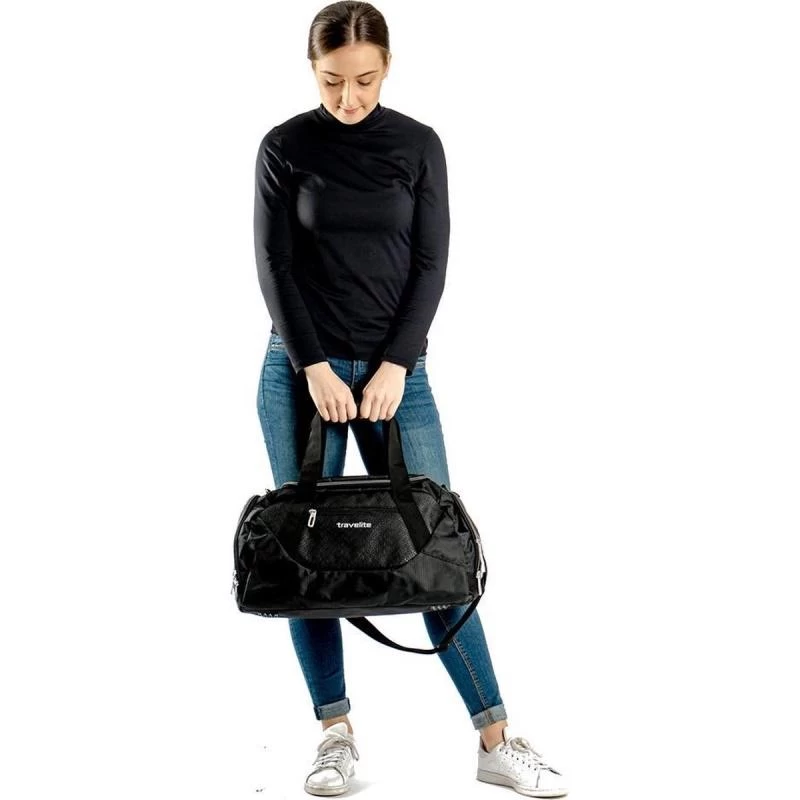 Reistas uit de Kick Off collectie van Travelite die ook als sporttas gebruikt kan worden. Deze ruime lichtgewicht tas sluit als bovenlader wat betekend dat het hoofdvak kan worden afgesloten met een U-vormige ritssluiting waardoor je gemakkelijk de tas kunt in- en uitpakken. Aan de voorzijde bevindt zich een ruim ritsvak evenals aan de binnenzijde. De sporttas heeft aan een zijkant een ritsvak en aan de andere zijkant een natvak met ritssluiting waar gebruikte en/of vuile textiel ingedaan kan worden. Middels de twee handgrepen aan de bovenzijde kan de reistas in de hand worden vervoerd. Aan beide zijkanten bevinden zich ook nog handgrepen. Aan de achterzijde zit een smart sleeve die gebruikt kan worden om de tas op het treksysteem van een trolley te bevestigen. Met behulp van de afneembare en in lengte verstelbare schouderband kan de tas crossover of op de schouder gedragen worden. Thuis kan de tas worden platgemaakt en zo gemakkelijk worden opgeruimd.