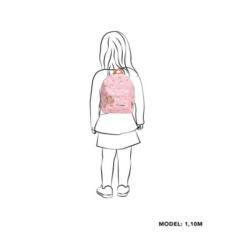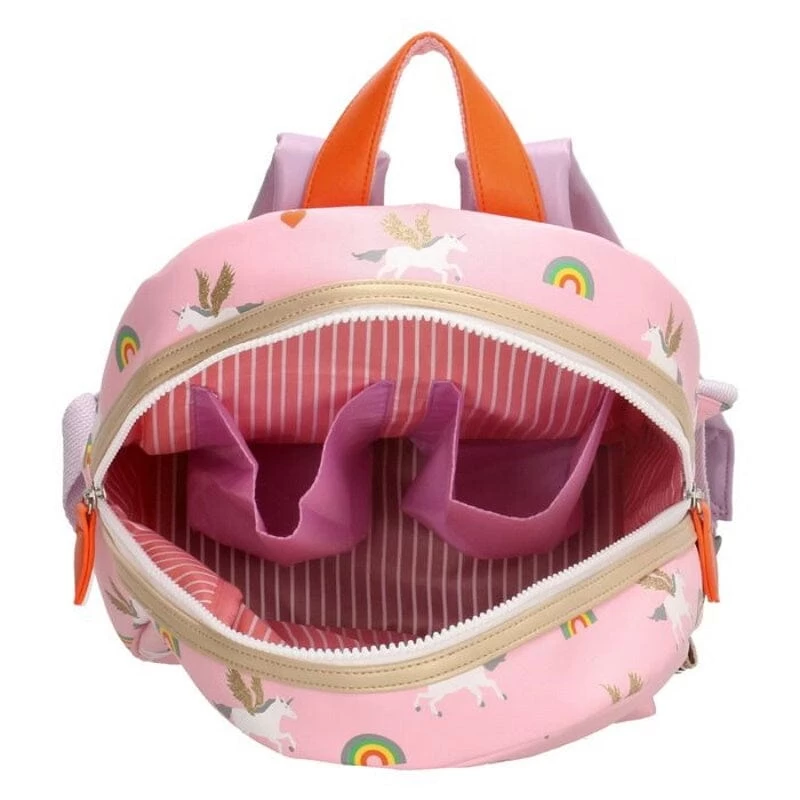 Prachtige shiny kinderrugzak van Zebratrends De gehele tas sluit met een stevige witte blokrits met dubbele sluiting. De tas is te dragen dmv het korte handgreep bovenop en de verstelbare schouderbanden. Binnenin de tas bevinden zich 2 drinkbeker vakken en een licht roze gestreepte voering. Het handige naamlabel zit achter de rugzak.