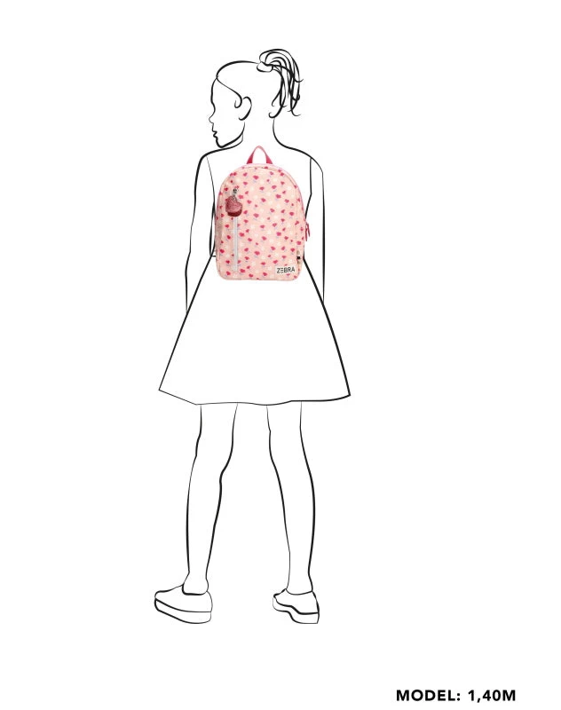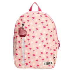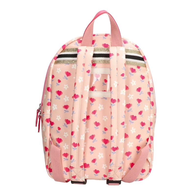 Prachtige glanzende PU kwaliteit is de basis van deze rugzak, versierd met gekleurde bloempjes. Hele leuke kleurcombinatie. Voorop zit een verticale roze rits afgewerkt met glitterhartjes, die dient als extra opbergvak. De gehele tas heeft een stevige zwart-witte blokrits met dubbele sluiting. De tas is te dragen dmv het korte hengsel bovenop en de verstelbare schouderbanden. Binnenin bevinden zich 2 drinkbekervakken en een vrolijke lichtroze gestreepte voering. Achterop het handige naamlabel.