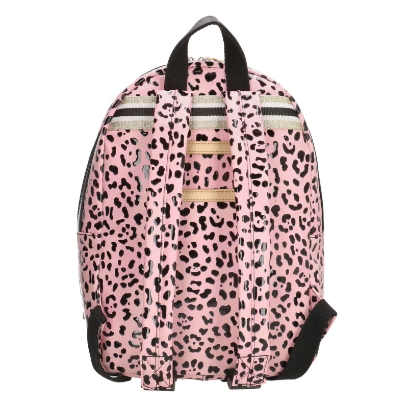Een PU panter print die ontstaat door zwarte lak spots. Taupe-variant in een middenmaat uitvoering. De rugzak heeft voorop een verticale rits in dezelfde kleur met gouden hartjes en dient als extra opbergvak. De gehele tas sluit met een stevige blokrits met dubbele sluiting. De tas is te dragen dmv verstelbare schouderbanden (in print) en dmv het korte hengsel bovenop. Aan de binnenkant van de rugzak bevinden zich 2 drinkbekervakken en een lichtroze gestreepte voering. Achterop zit het bekende naamlabel.